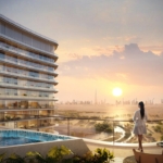 The building’s modern design features minimalist details, simple and symmetrical shapes, and a neutral color palette, embodying the contemporary architectural style of Dubai’s skyline. Expansive windows and spacious balconies with glass railings ensure that the structure shimmers in the sunlight, offering residents breathtaking views of the surrounding cityscape.