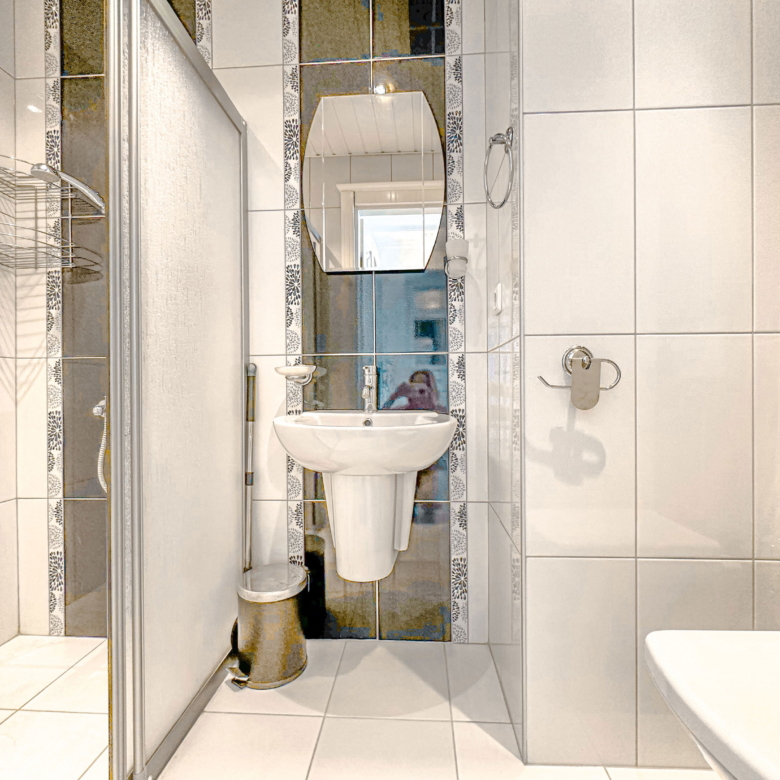 Although the apartment measures 55 m², the open-plan layout and bright palette create an illusion of greater space. White and soft grey tones dominate, reflecting natural light from large balcony doors. Consequently, the apartment feels airy, fresh, and contemporary.