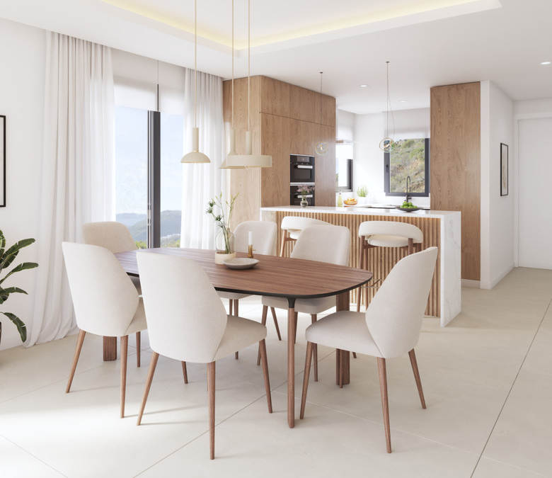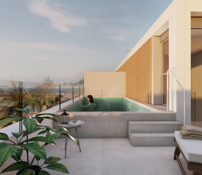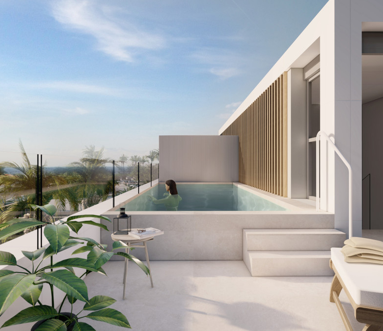The villas located on the corners have their own garden and private pool with salt chlorination. The central villas have the pool located on the third floor of the house. The open and functional spaces are undoubtedly the protagonists of the homes, they connect us with the terraces and their wonderful views of the sea, golf course and mountains.
