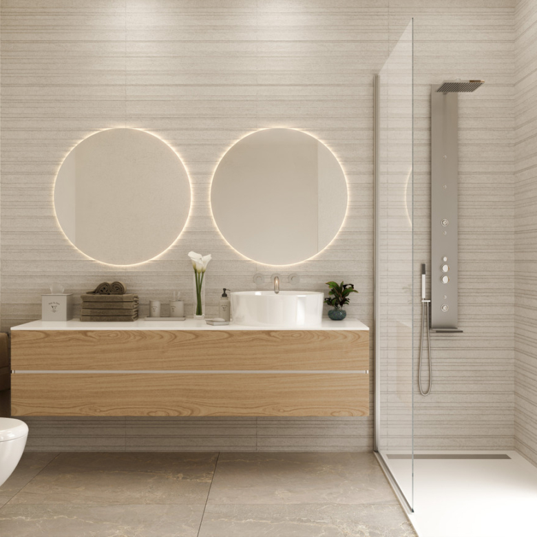 The architecture combines natural materials such as natural stone and wood with sleek lines and warm finishes.