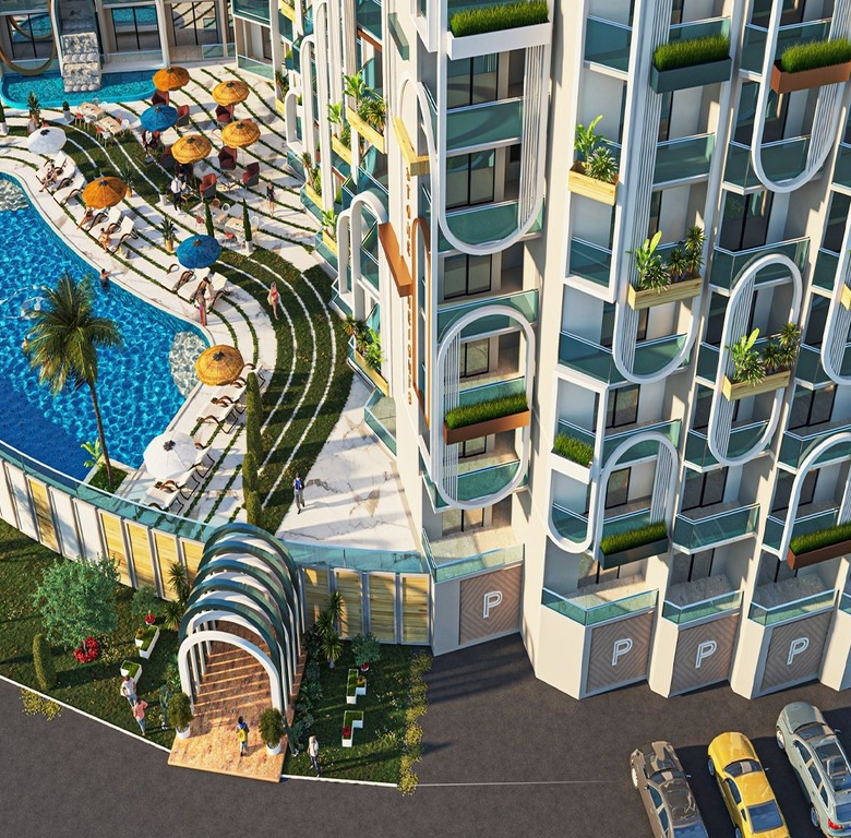 The project boasts a spacious outdoor area with a beautiful swimming pool, a garden, and a relaxing terrace where you can soak up the sun. The large windows and balconies in the apartments allow you to enjoy the breathtaking views.