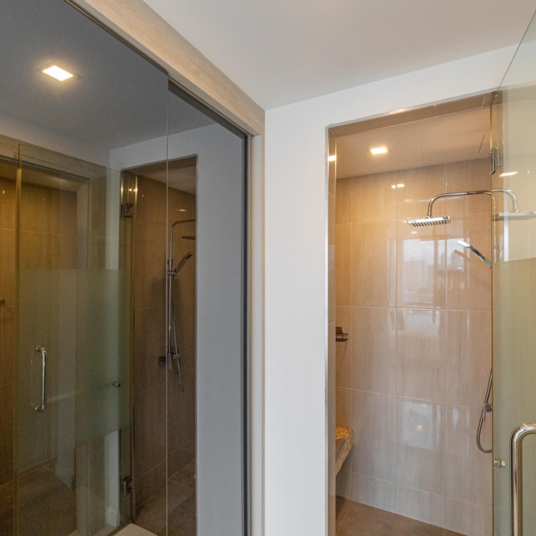 Modern Design: Interiors are adorned with high-quality fixtures and fittings, including mosaic-tiled bathrooms, glass shower doors, and built-in wardrobes in the bedrooms.