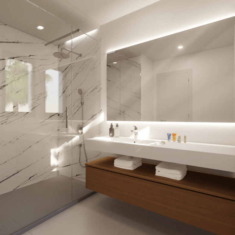 The complex is next to a green area, which will be designed using beautiful trees and a little park where you can walk and enjoy the fresh sea breeze. The landscaping blends perfectly into the area.