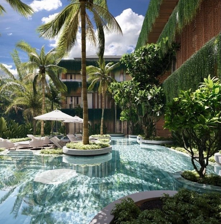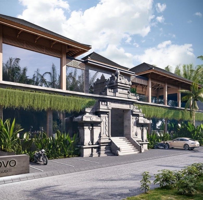 The development offers a full suite of on-site amenities including a fitness club, restaurant and bar, coworking space and a full-service spa with its own pool and relaxation area, all framed by tropical landscaping. The building’s modern architecture is complemented by a traditional Balinese entrance with stone carvings, covered balconies and secure parking provisions.