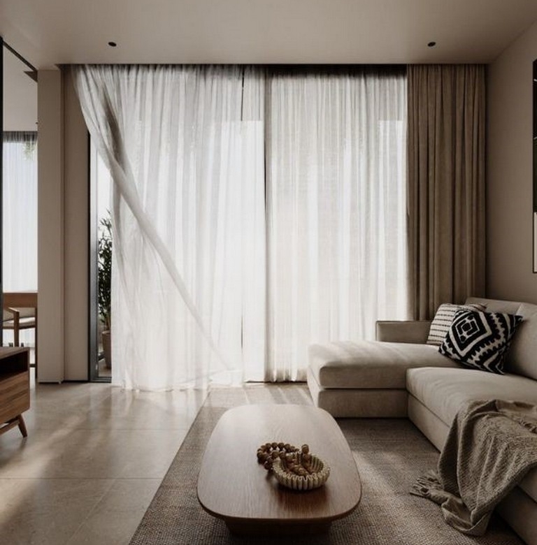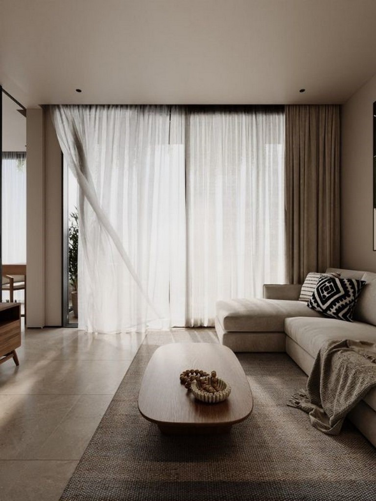 The interior layout emphasizes a seamless indoor–outdoor flow: an open-plan living room and kitchen open to a private terrace, creating a bright, airy atmosphere. Finishes are warm and restrained — light wood cabinetry and shelving, a marble countertop at the kitchen island with two wooden bar stools, ambient shelf lighting, a round wooden coffee table and a light-coloured sofa with textured throws. The separate bedroom is a calm retreat with a large bed dressed in brown and beige tones, abstract artwork, sheer curtains admitting generous natural light, and a dedicated workspace adjacent to a walk-in closet fitted with wooden shelving and woven storage baskets.