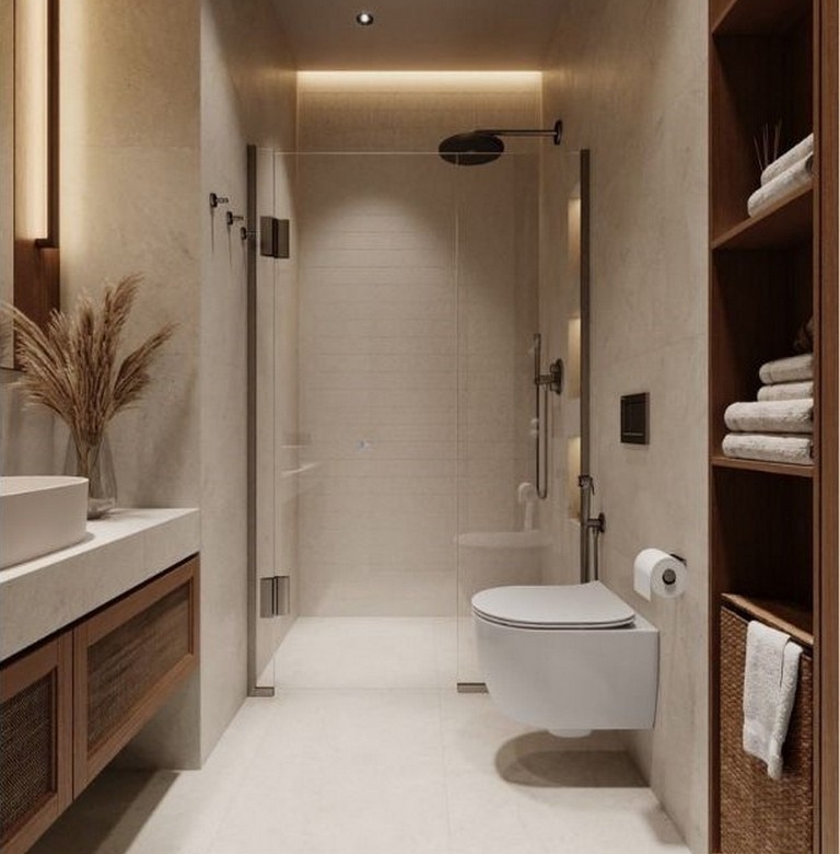 A refined bathroom enhances the apartment’s contemporary feel with a glass-enclosed shower and rainfall showerhead, a wall-mounted toilet, and a wooden vanity topped with a white vessel sink and woven drawers, all set against light neutral tiles and stone-like flooring. Practical touches throughout — integrated shelving, natural textiles and a potted plant — reinforce the understated, tactile palette.