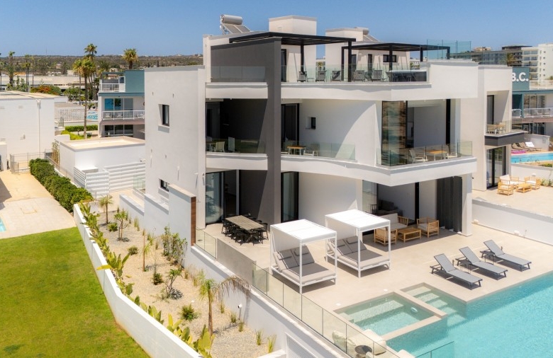 This luxurious beachfront villa project in Ayia Napa features two exquisite villas, offering unparalleled seaside living with modern elegance and breathtaking Mediterranean views. Each villa spans multiple levels, designed for comfort and sophistication. The lower floor includes a bedroom, bathroom, and storage room, while the ground floor boasts an open-plan kitchen, spacious dining and living area, guest WC, and outdoor deck with a pool and jacuzzi. The first floor offers three ensuite bedrooms, providing a private retreat for each resident. The rooftop garden is the highlight, featuring a BBQ area, jacuzzi, and an additional WC, perfect for relaxation and entertaining. With an elevator connecting all floors and parking for two cars, these villas are designed for absolute convenience and luxury. Situated in the heart of Ayia Napa’s coastal paradise, this is an exclusive opportunity to experience the best of beachfront living.