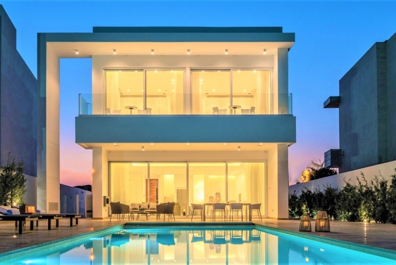 Blue Waves consists of 7 one-line luxury beachfront villas which seats on the most tranquil beaches on the island. Blue Waves is situated 200 meters from the town centre and Protaras Marina. The villas are fully equipped smart residences which boast Class A energy efficiency. The user friendly smart villas allow the owner to control the smart features from wherever they may be in the world. Main features of the properties include 5 unsuited bedrooms, an infinity pool with a waterfall feature, cinema, gym and a car lift. Each villa is also equipped with cameras, alarm systems, keypad entry systems, high walls and trees for privacy.
