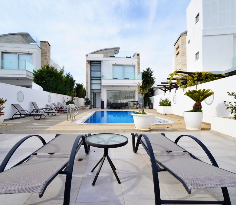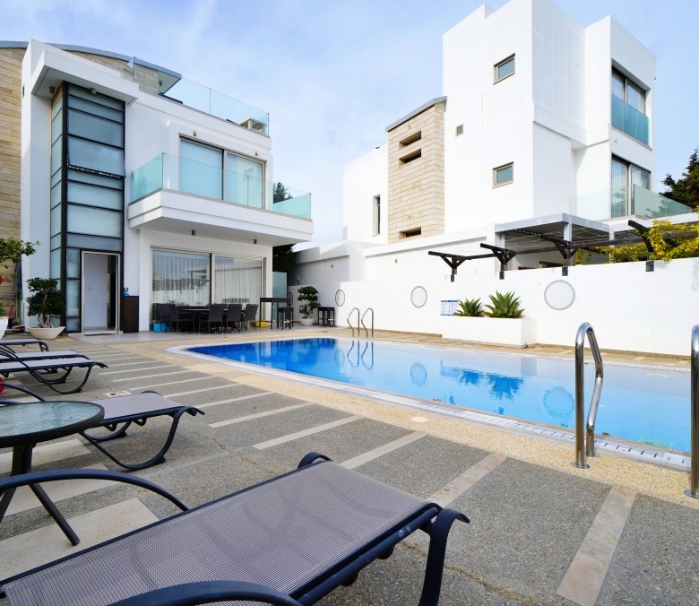 Presenting an exceptional 5-bedroom villa nestled in the prestigious Protaras seafront area. As you approach the exclusive complex, impressive electronic gates ensure privacy and security, leading to the underground garage accessible via separate electronic doors for each property. An internal elevator provides access from the basement garage to each floor. The basement features a self-contained living space with a double bedroom, bathroom, small kitchen/utility area, and a spacious living room ideal for a cinema room or snug. The main floor offers an open-plan living, dining, and kitchen area with floor-to-ceiling patio doors opening onto the magnificent pool terrace, perfect for entertaining. The modern kitchen is fully equipped and leads to the back garden. Additionally, a ground floor bedroom and shower room provide convenience. The first floor hosts three double bedrooms, all with fitted wardrobes and ensuite shower rooms. The master bedroom boasts a larger walk-in shower and wall-to-wall patio doors opening onto a glass-walled veranda with sea views. Further, the villa features a large roof terrace with panoramic sea views, perfect for enjoying serene evenings or storm watching. The garden is ideal for hosting parties or family gatherings, featuring an expansive plot, uncovered pool terrace, covered outdoor kitchen and dining area, and a roof terrace. This stunning villa offers tranquility yet is close to all amenities and beaches, making it an excellent residential home or investment opportunity. Viewing is highly recommended to appreciate its outstanding features!