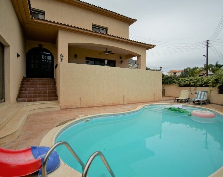 Α 4 bedroom detached villa for sale in Germasogeia, Limassol. It is located in a quiet area with sea views. The house is split over 2 levels with provision for a third floor. The ground floor consists of an entrance hall with water feature, an elevator, separate living room, open plan kitchen with dining area and a separate open space with feature wooden ceiling currently being used as a game room with bar and guest WC. The first floor has 4 bedrooms including master with en suite and jacuzzi, family bathroom also with jacuzzi. Outside there is a spacious veranda overlooking the sea, private swimming pool and extra guest WC with shower.