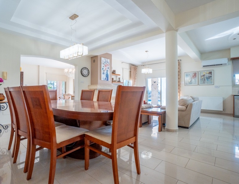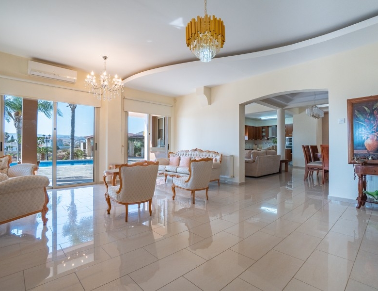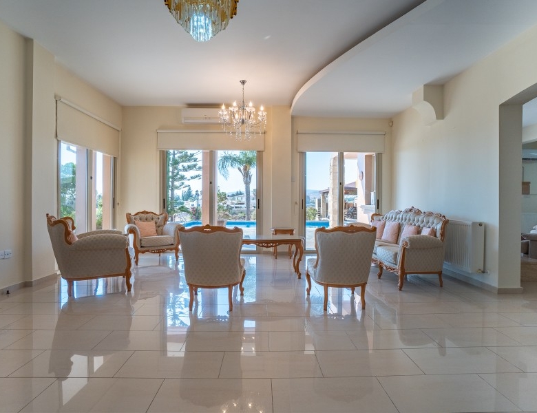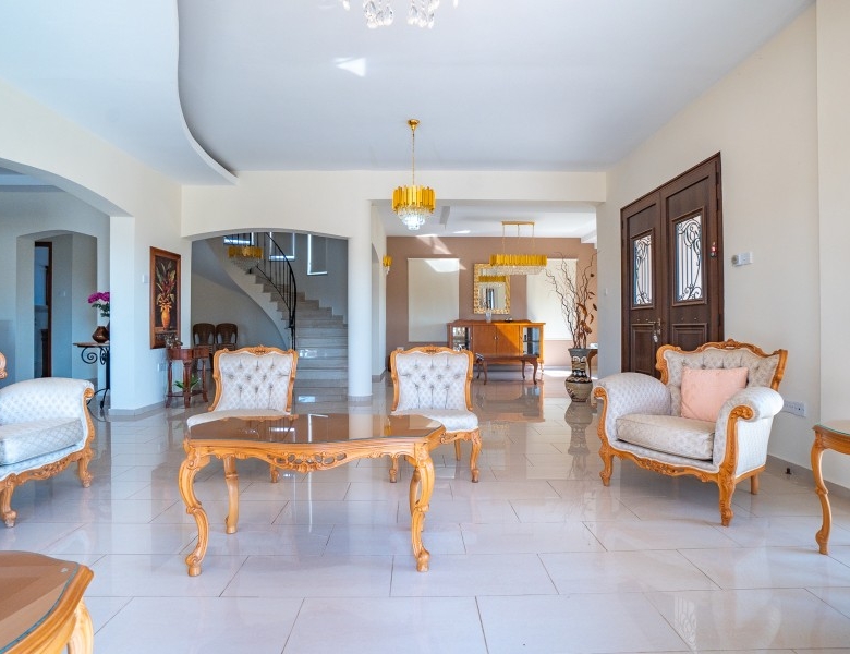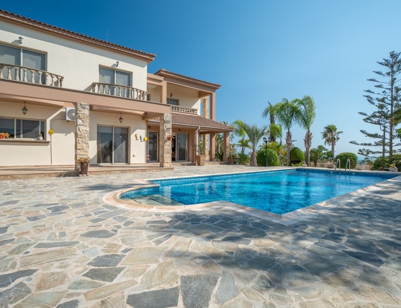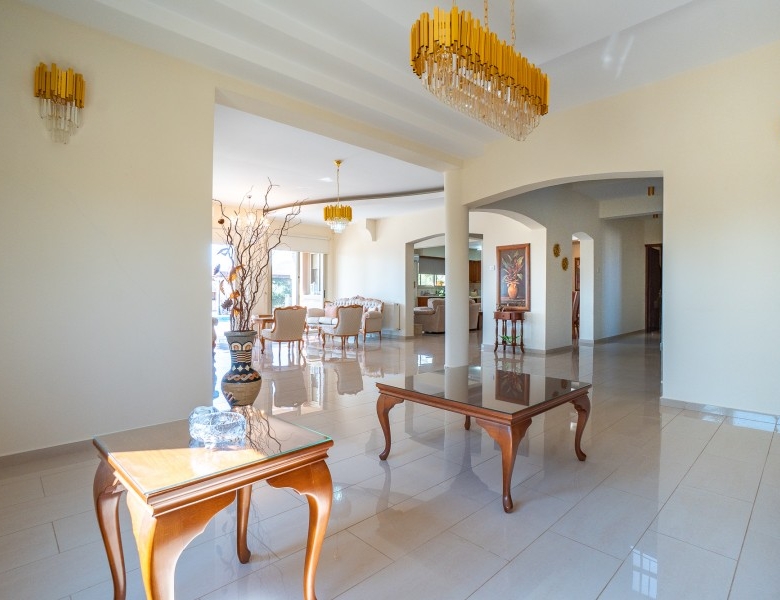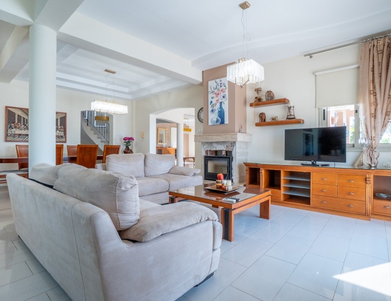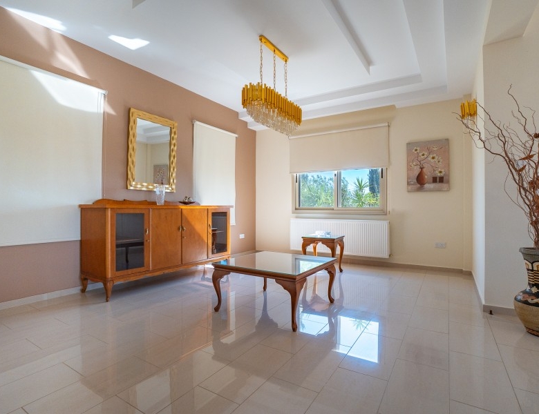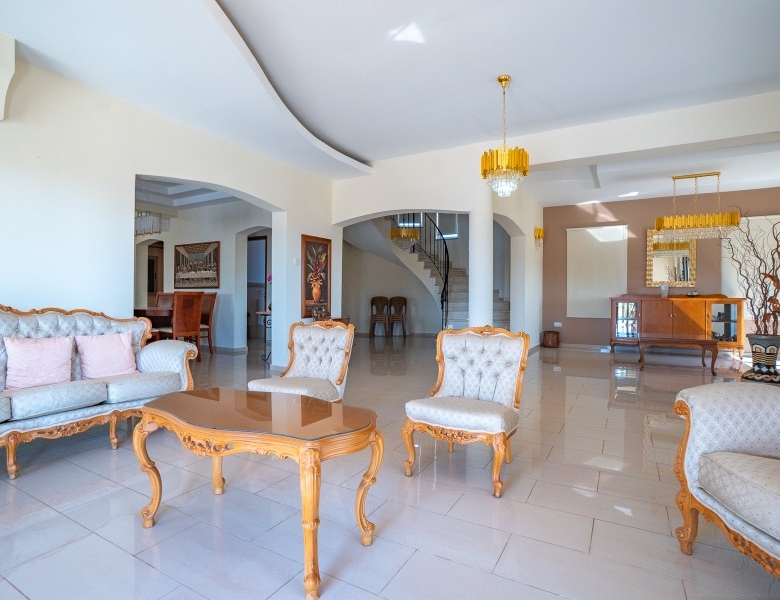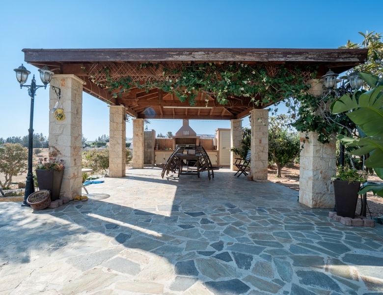 A Large luxurious Villa set in the hills of Anarita offers exclusive privacy and comfort. The villa, covering 360sqm has been built on a large plot of 3000sqm and is surrounded but mature landscaped gardens, with a large covered barbeque area and private swimming pool. As it is built on the hill is also allows for lovely views of the mountains at the back and sea views at the front. Upon entering the house you are met with two open sitting rooms either side of you and a large open kitchen in front with a connected dining area. One bedroom on the ground floor with its own bathroom give ease of living. Upstairs there is a large landing area with a small kitchenette, equipped with storage space and a washing machine. There are 3 large bedrooms on the first floor including the master bedroom with its walk-in wardrobe and ensuite bathroom.