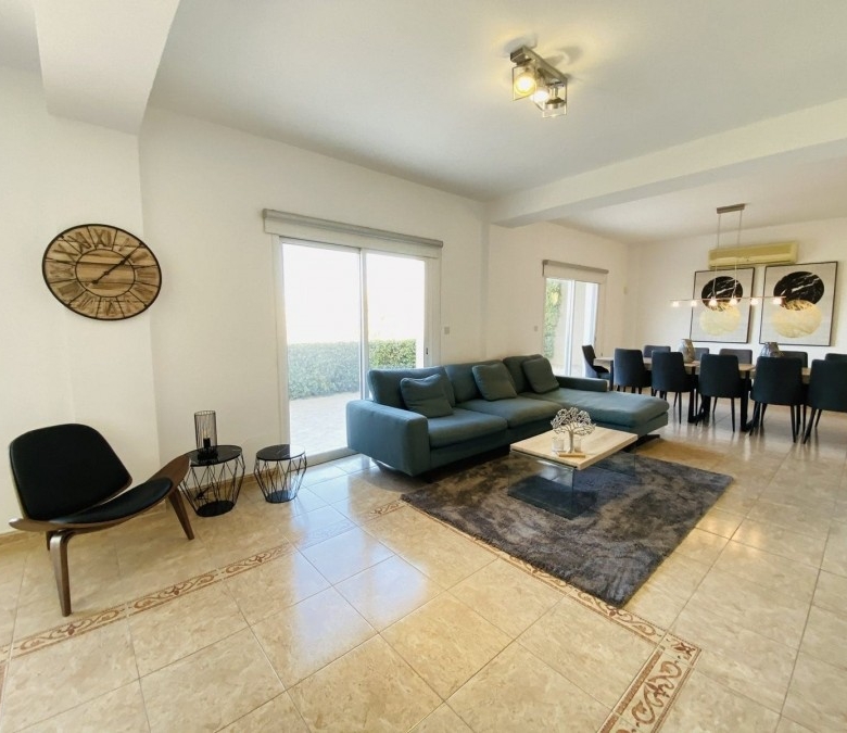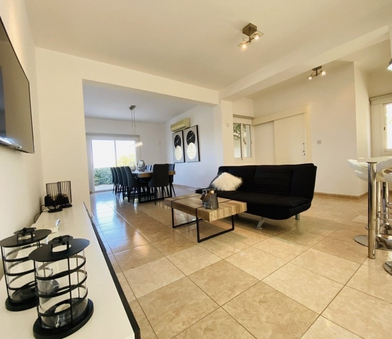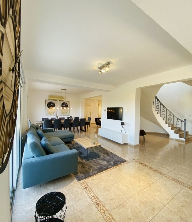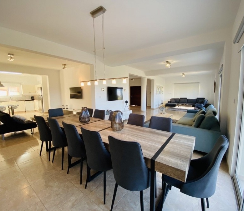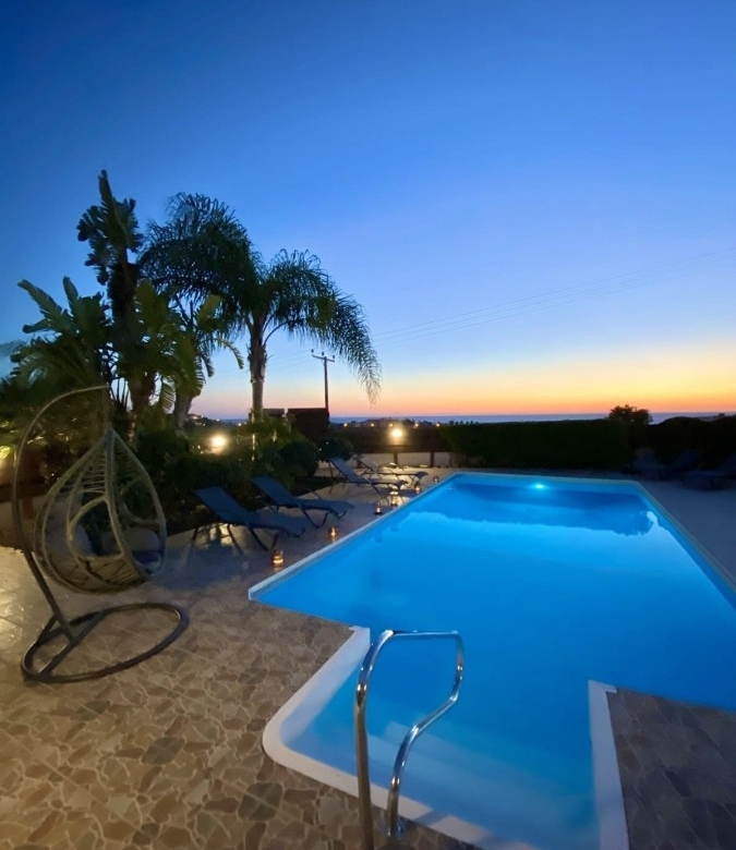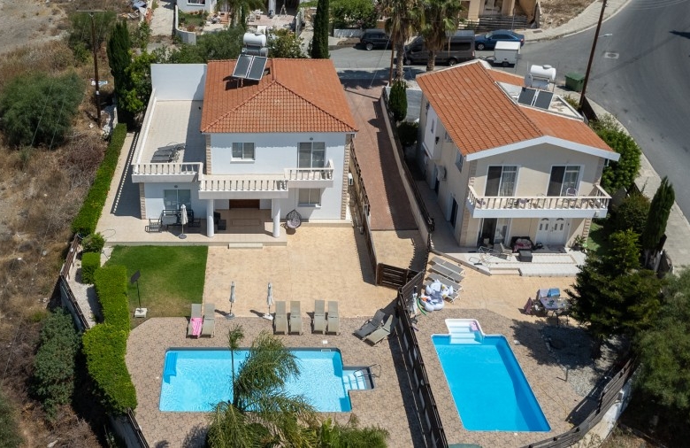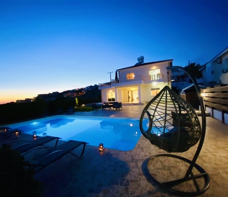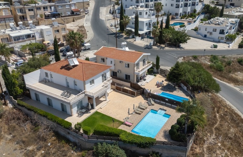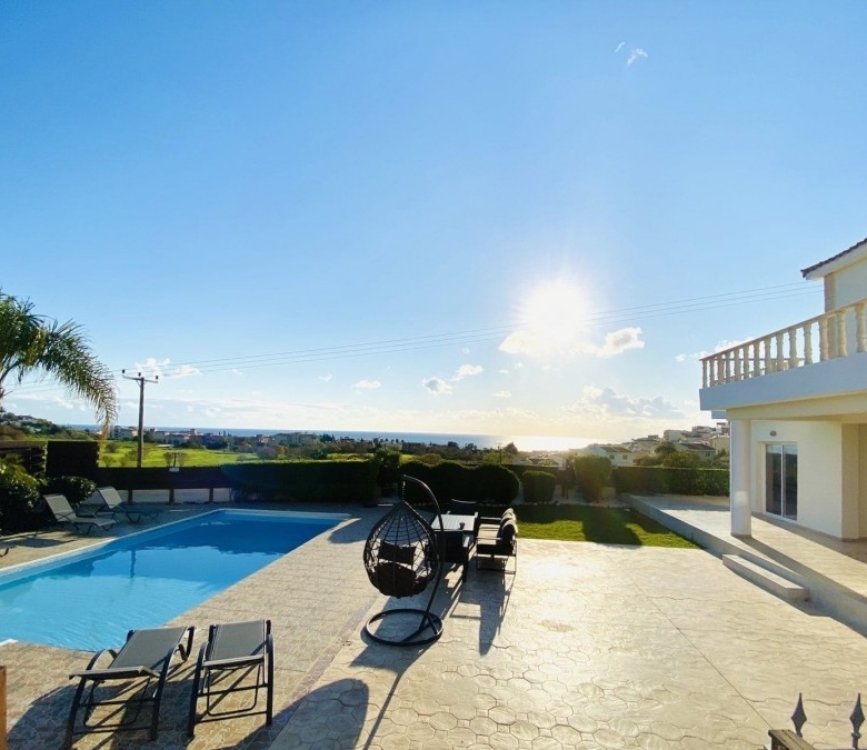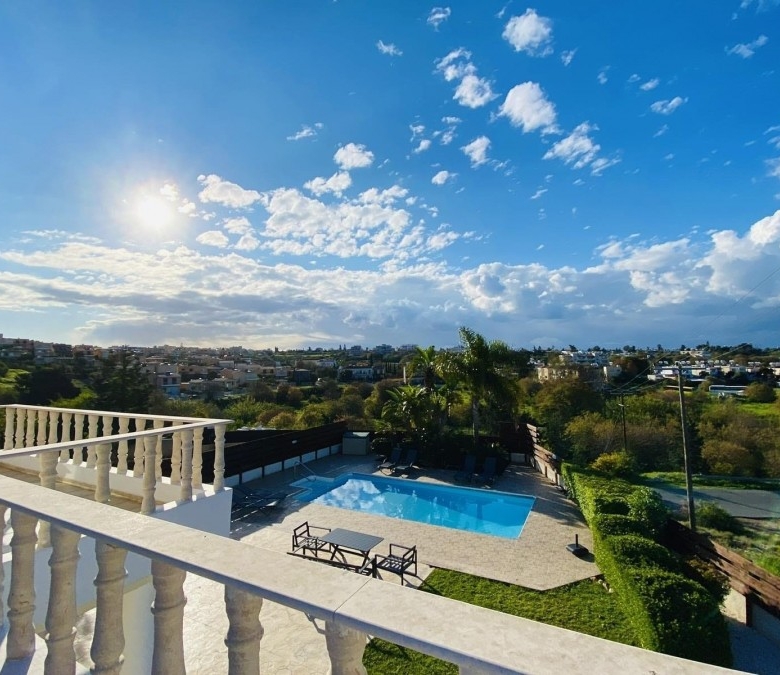 This 5 bedroom villa is located in lower Chloraka -Pafos. The entrance, dining room, 2 living rooms, kitchen, 2 bathrooms, kitchennete, & 1 bedroom(guest room) are on the ground floor while 4 bedrooms and 2 bathrooms on the 1st floor with the master bedroom en-suite & utility room on the top. The covered area of the villa is 300 square meters, the verandas 80 square meters while the plot is 800 square meters. The villa has a private road leading to its entrance with an electric gate. It has a private swimming pool, fully fitted kitchen, laundry room, double glazed windows, air conditioning, provision for central heating, store room, fly screens, jacuzzi, pool shower, open parking. The villa has amazing sea view and Mountain View but at the same time its very close to the center of Pafos.