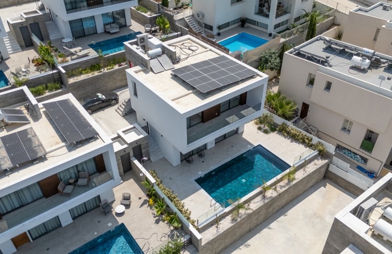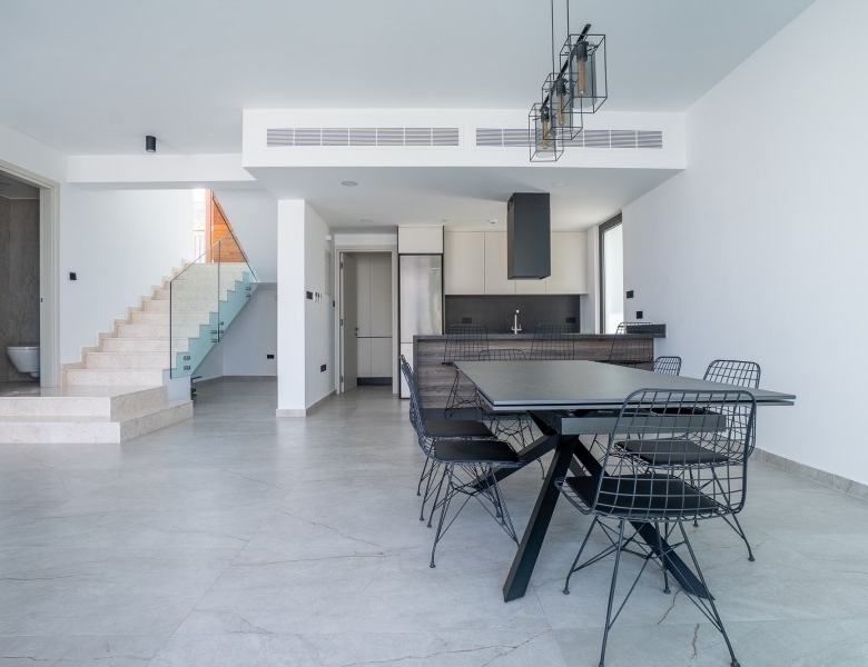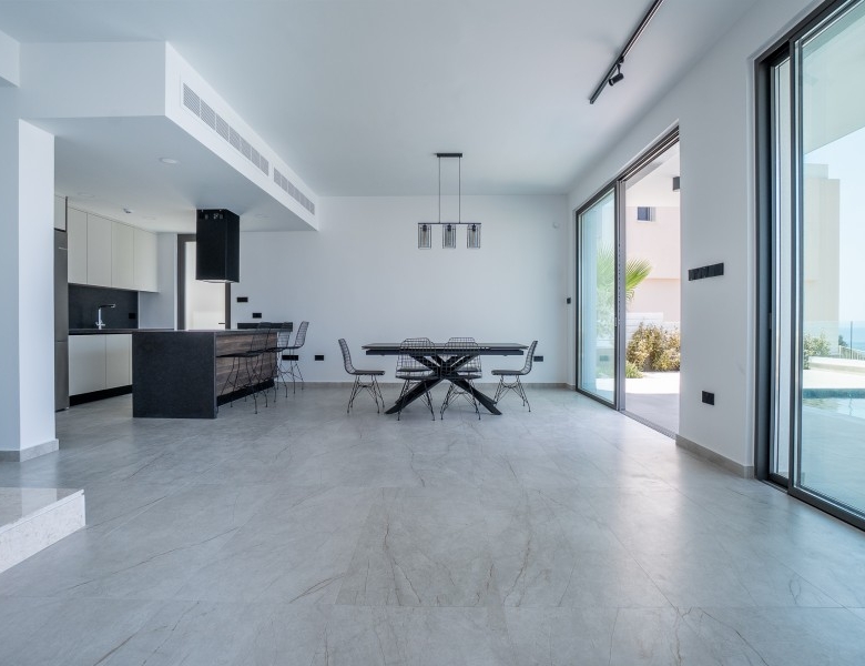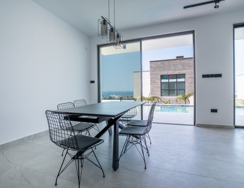 This newly completed detached villa is located in Chloraka, Paphos, within walking distance of local amenities and only a five-minute drive from the beach. The property is situated on a 350 m² plot with landscaped gardens and a 32 m² private swimming pool, offering both sea and mountain views.