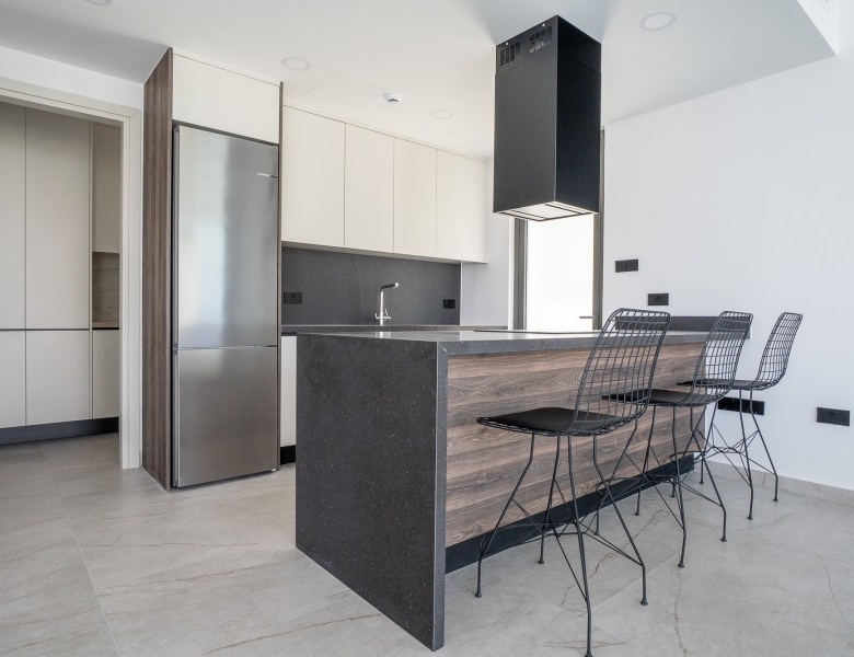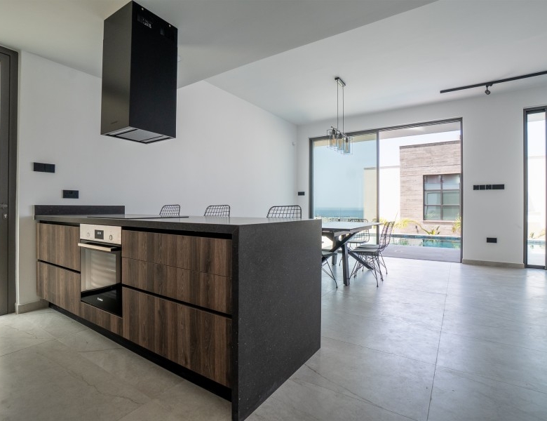 The villa provides a total internal covered area of 153m² plus covered veranda 25m², uncovered veranda 46m² and comprises three bedrooms, including a master with en-suite facilities, as well as a guest toilet. The interior features an open-plan layout with a main fully fitted kitchen, in addition to a separate auxiliary kitchen, both equipped with appliances. Tile flooring is installed throughout the house, and the property is offered partly furnished.