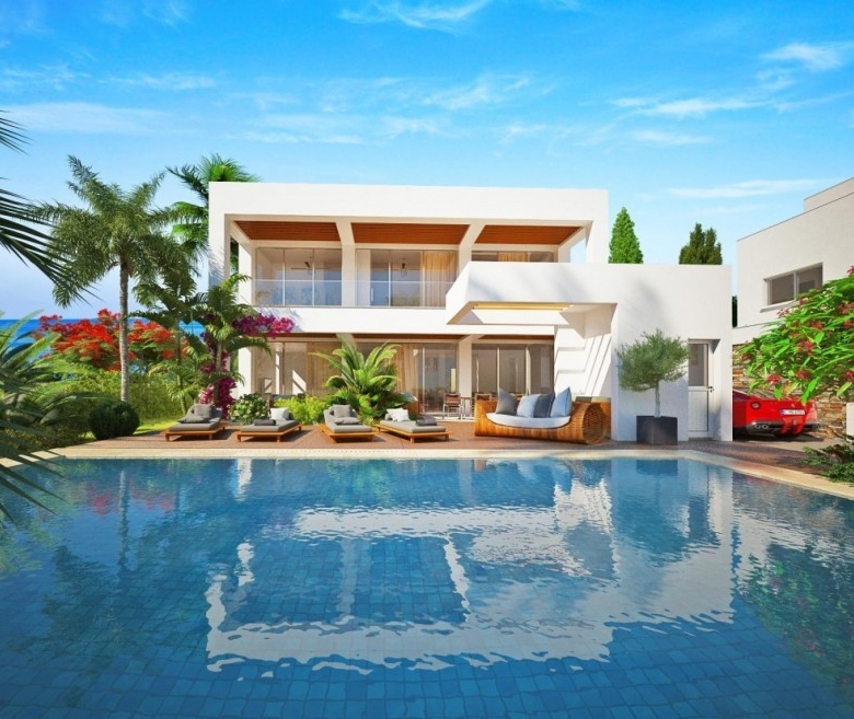 A modern design 3-bedroom villa for sale, located in the heart of the tourist area of Paphos in Cyprus. The property is designed in a large plot and enjoys a private swimming pool with spacious outdoor areas. The villa is located in front of one of the most famous sandy beaches in Paphos and enjoys easy access to a variety of restaurants, pubs, bars, 5-star beach resorts, and other amenities.