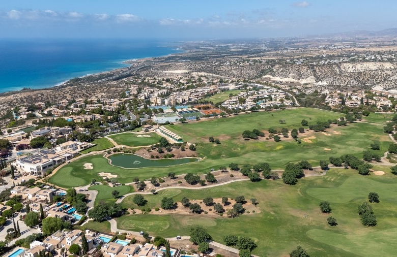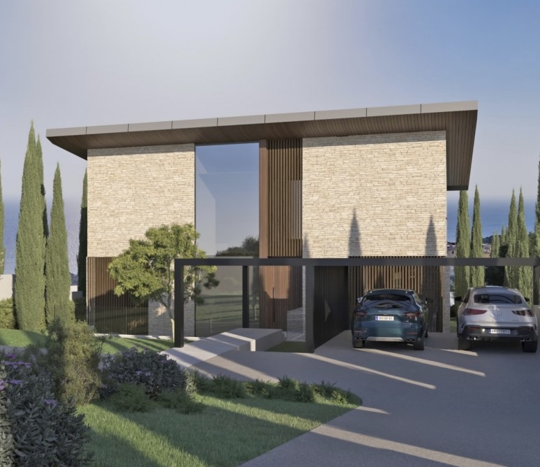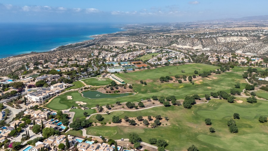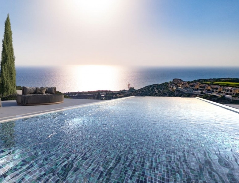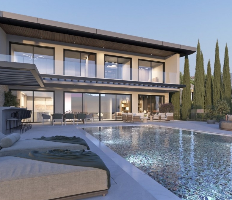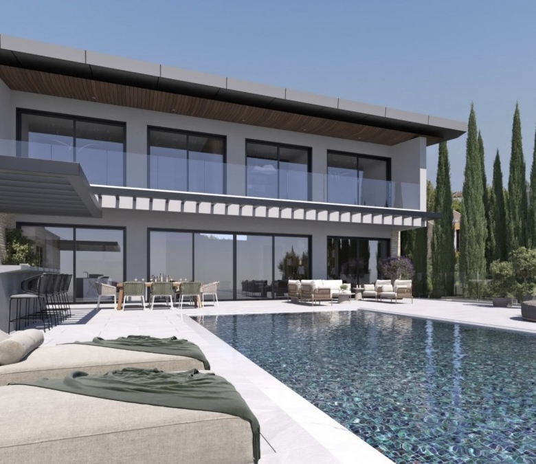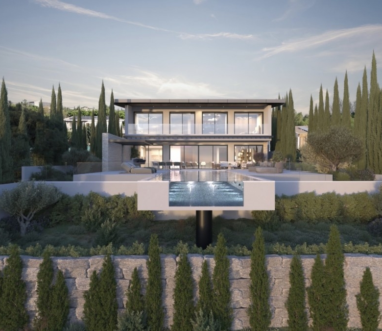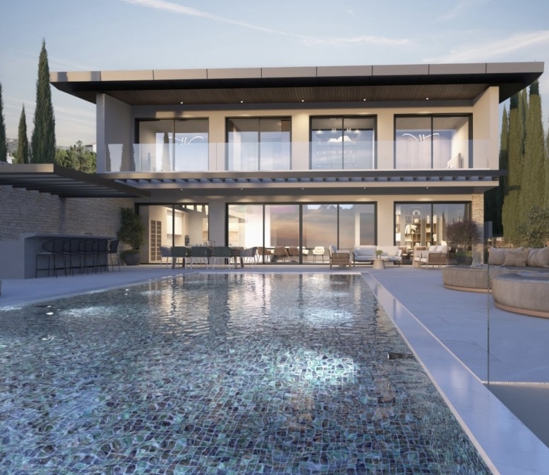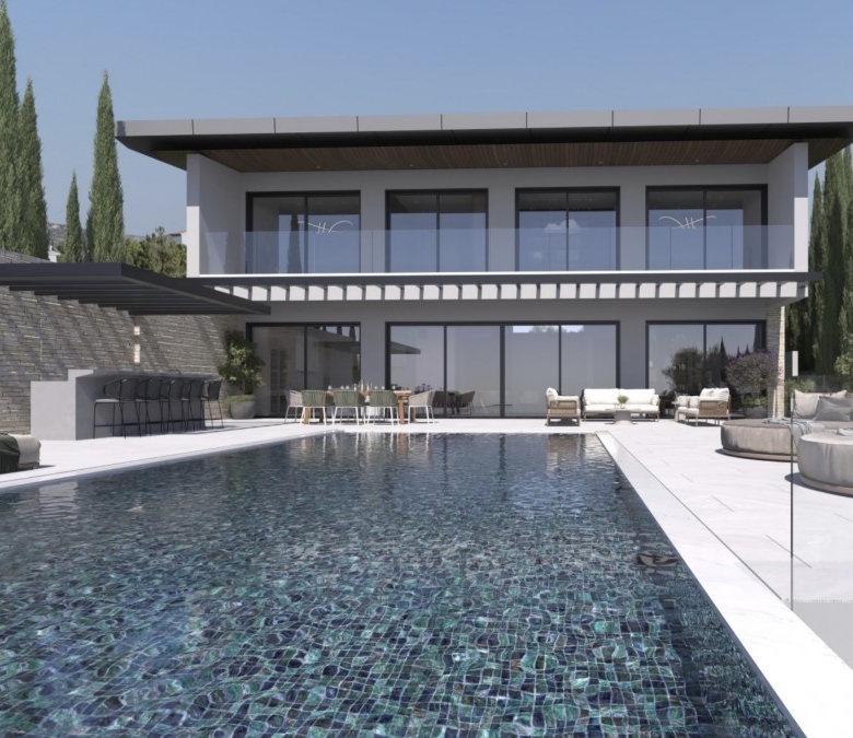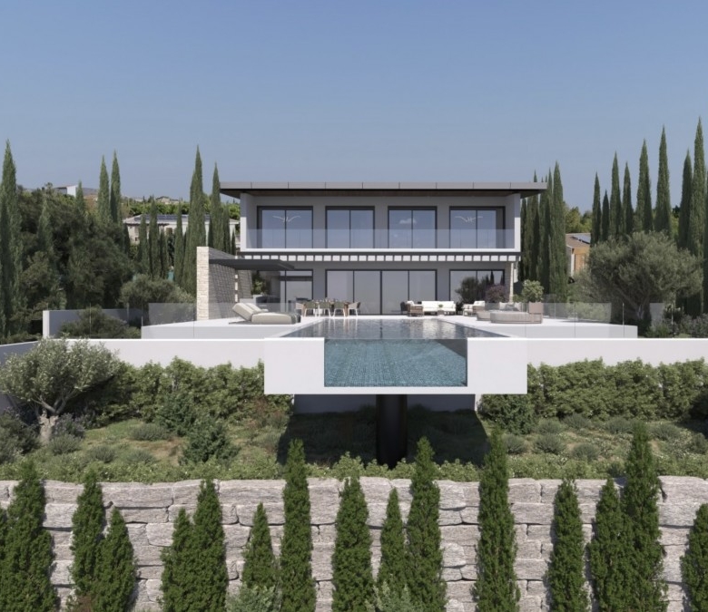 This property represents one of the last opportunities to purchase a new state of the art luxury villa on the front line of Aphrodite Hills. It is currently in construction with completion around 12 months away. It will be built with the emphasis on high ceilings and opan plan living with light filled areas maximized by the abundance of glass. It will be furnished with the Roberto Cavalli brand throughout offering wooden floors and high end fittings. All of the bedrooms will have their own en suites and dressing rooms with a large gym and sauna as well as an internal lift and car lift to the basement parking area. Externally the infinity style swimming pool will measure 15m x 5m with a spacious entertainment terrace. Additional Features: Roberto Cavalli Furniture, Security Alarm System, Private Parking, Car Lift, Gym, Sauna, Large BBQ Area, Lift, Large Swimming Pool. Custom made Italian wardrobes and internal doors 3.2 m height. Underfloor heating in all floors. VRV LG AC units in bedrooms, bathrooms and living room/dining areas, Long modern plasma type fireplace dressed with onyx with light. Electric aluminum patio doors with 8 mm + 8 mm low E glass (energy saving). Thermal brick perimetrically on external walls. Villa walls and roof dressed with 8 cm polystyrene for thermal protection. Italian tiling or equal in bathrooms with mosaic combination and Grohe mixers and accessories in bathrooms as well.