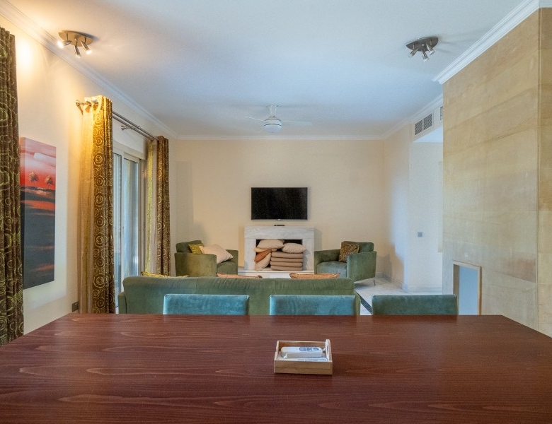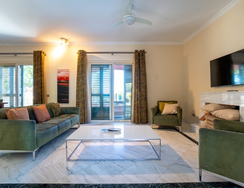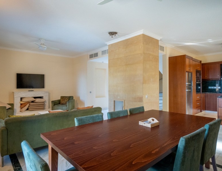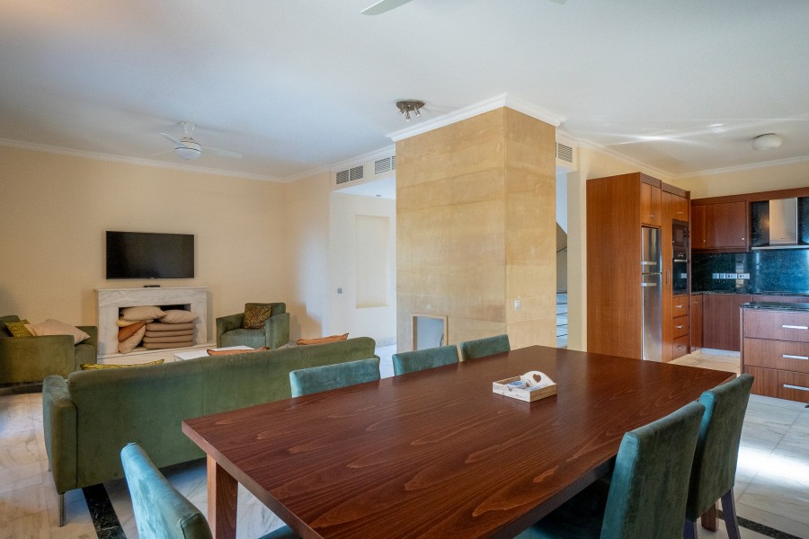 The villa has a spacious living room and an open plan dining room with open fireplace. Doors with a double patio open onto a large covered veranda overlooking the pool and landscaped gardens. The kitchen gives access to a large barbecue area. Upstairs there are four bedrooms with bathrooms. On the lower floor there is a T.V room, a sauna, a warehouse, a utility room and an additional bedroom.
