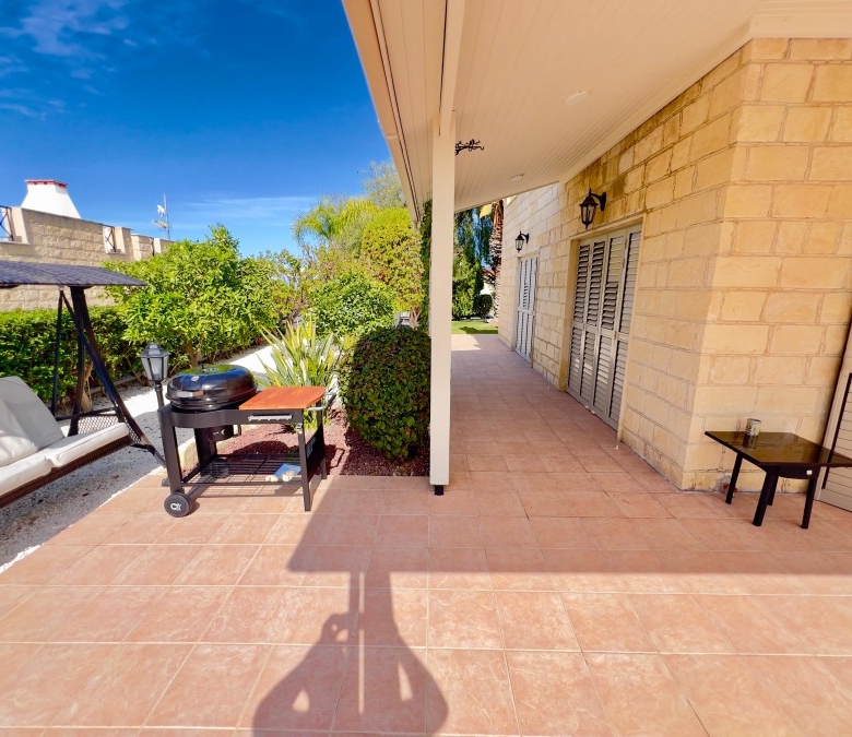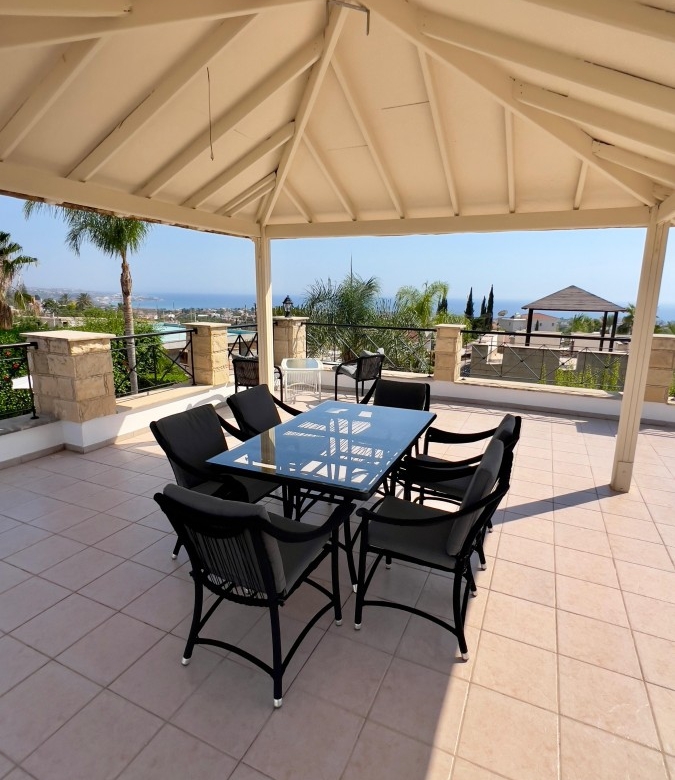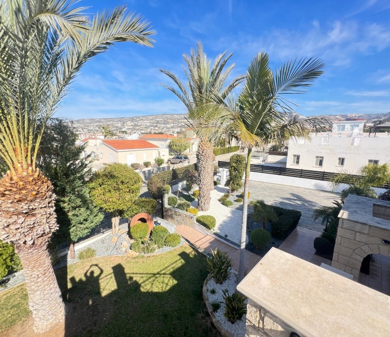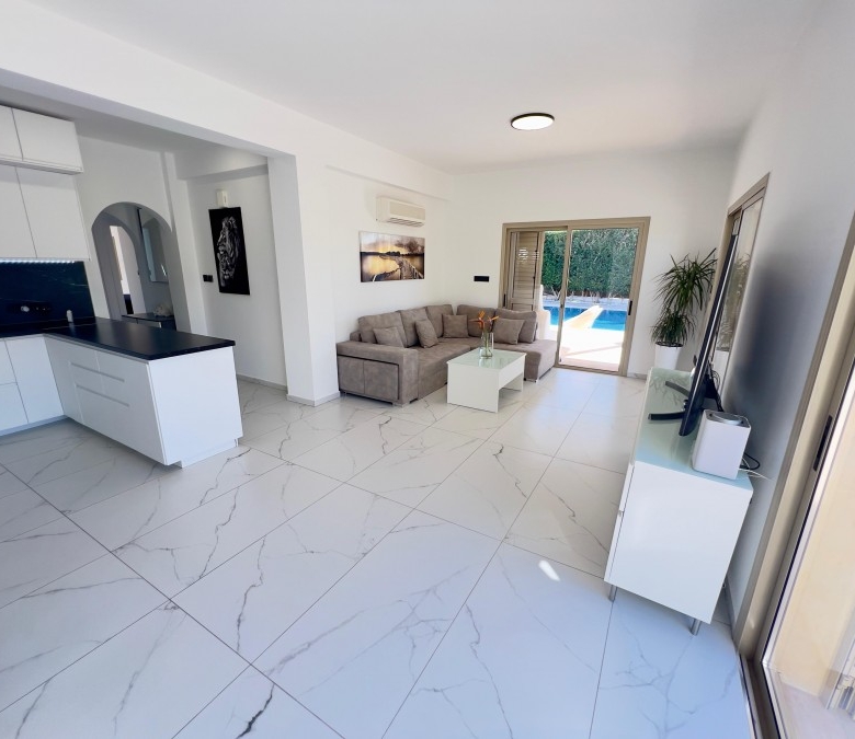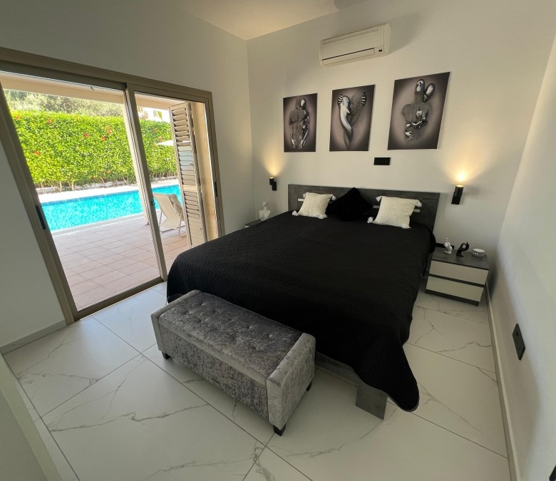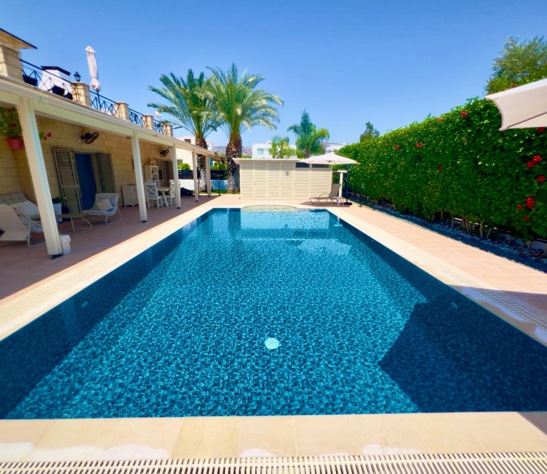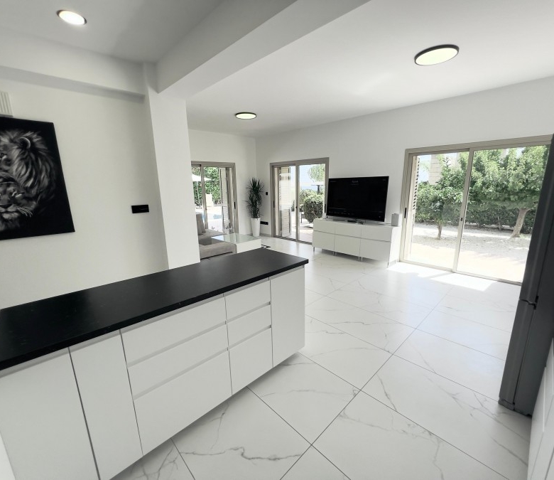 Luxury villa for sale in a prime location with stunning sea views in Paphos (beginning of Peyia, just 2 minutes from Coral Bay Beach). The villa has a covered area of 180 m² and sits on a large 1000 m² plot. It features 3 bedrooms, 2 bathrooms, and underwent a full high-quality renovation in 2024, including a brand-new swimming pool, new landscaping, and an extensive interior and exterior upgrade. In fact, you are buying a virtually new villa, but with the title already issued — no need to wait 3–5 years. The property includes a beautiful, well-maintained garden with 30 palm trees, a variety of flowers, and fruit trees. There is a large private swimming pool (12x5m), parking space for up to 5 cars, a new-generation Smart Home System with voice control, premium “Neff” kitchen appliances, and Italian marble floors with underfloor heating throughout. The house is clad in natural stone, adding elegance and durability.