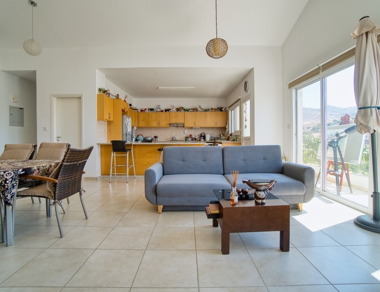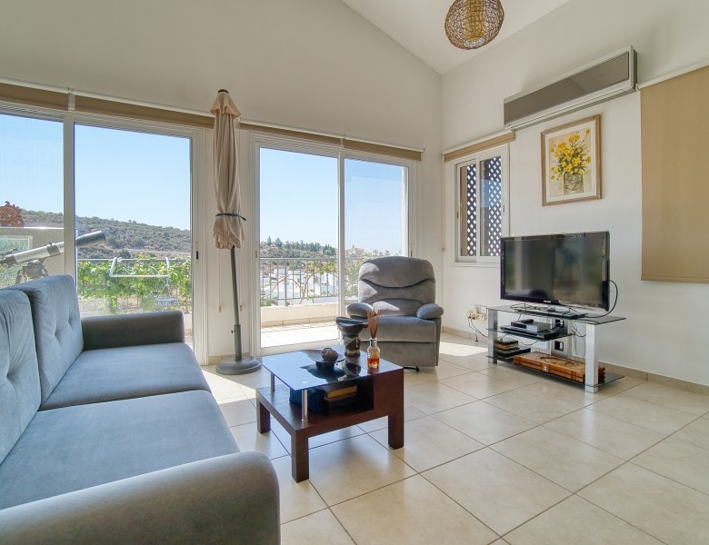 Lovely 3 Bedroom Semi Detached Villa for sale in Peyia Village. This is an upside down house. Entering the property on the first floor with a spacious open plan living/dinning/kitchen with breakfast bar, guest toilet and access to balconies and the parking space. Internal stairs leading down to the 3 double bedrooms with the master having an en suite shower and the other two sharing the family bathroom. The property offers private covered parking, well maintained mature gardens with fruit trees and lovely sea and mountain views from the balconies. Externally there is an extra large closed room which can be converted into an extra separate studio apartment or can be used as a gym or storage area.Features: Air conditioning, granite worktops, double glazing, fly screens, water pressure system, private covered parking. Property is sold fully furnished and with full title deeds.