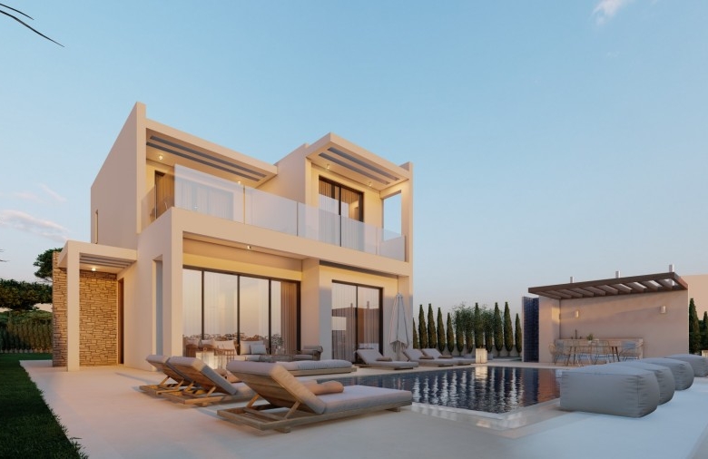 Situated next to the Akamas Peninsula, a natural park protected by UNESCO, these 3-bedroom private villas offer privacy and enjoy superb views of the Mediterranean coastline and greenery. Each villa is individually styled, with its private pool, offering the optimum stylish living. Ideal for a holiday or permanent home, or even an excellent investment opportunity. The two beaches (St George and Akamas) are just a 10-minute walk away, and the coveted TLC Private English School is only 5 minutes away.