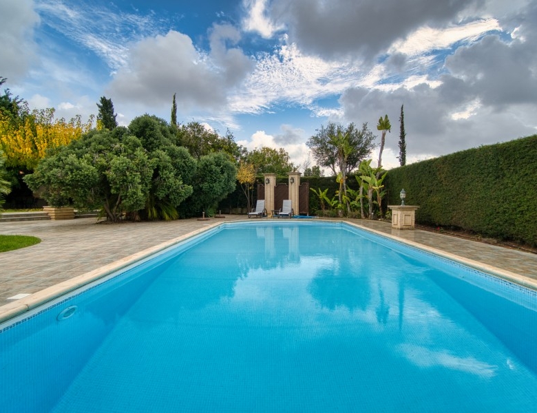 The exit through the double French windows opens up to the mature garden and the swimming pool to the right/front of the plot there is a nice hedge running around the length of the land offering lots of privacy for sunbathing and relaxing by the pool.