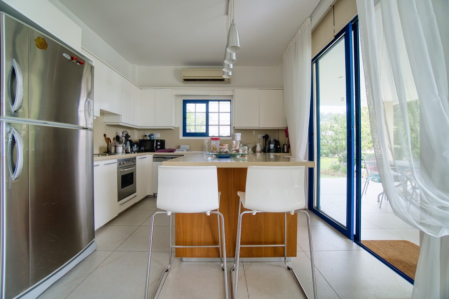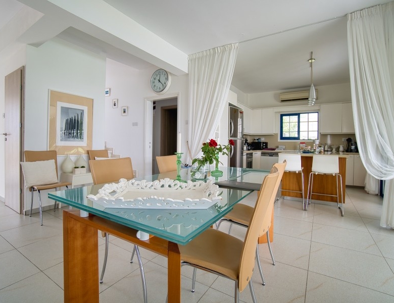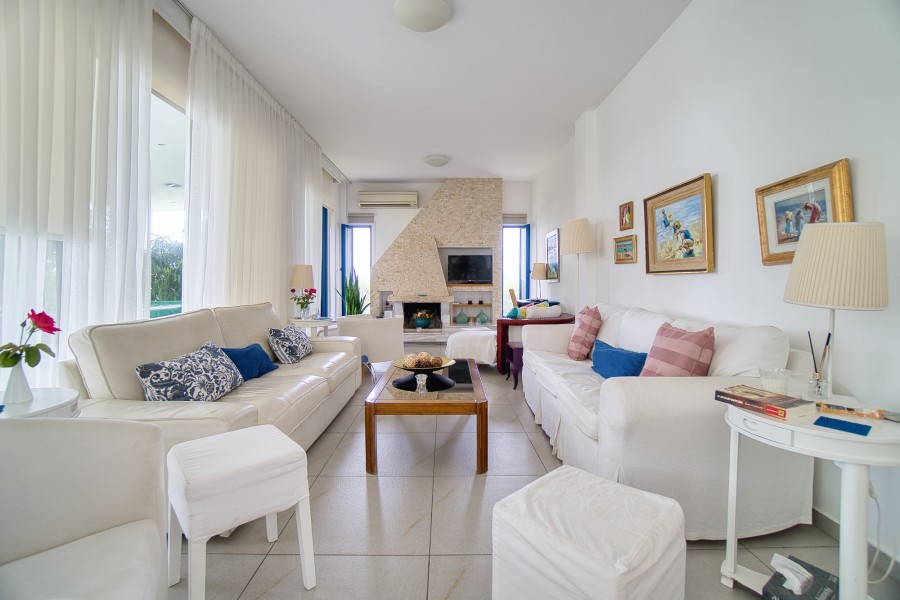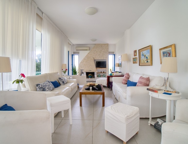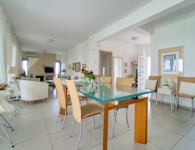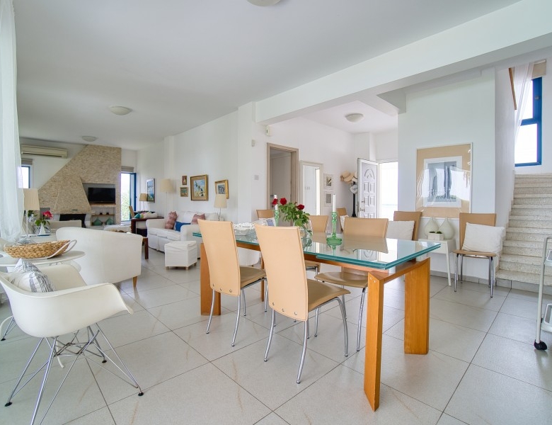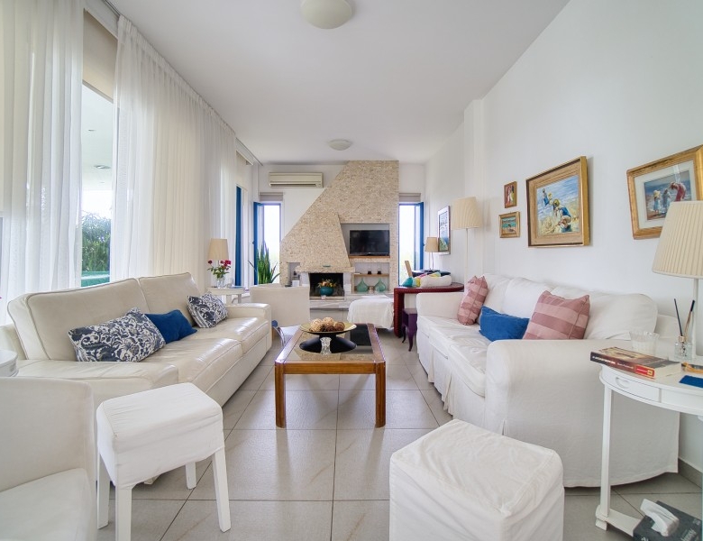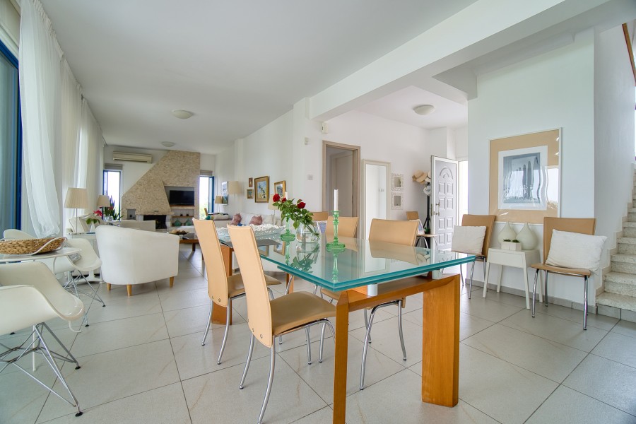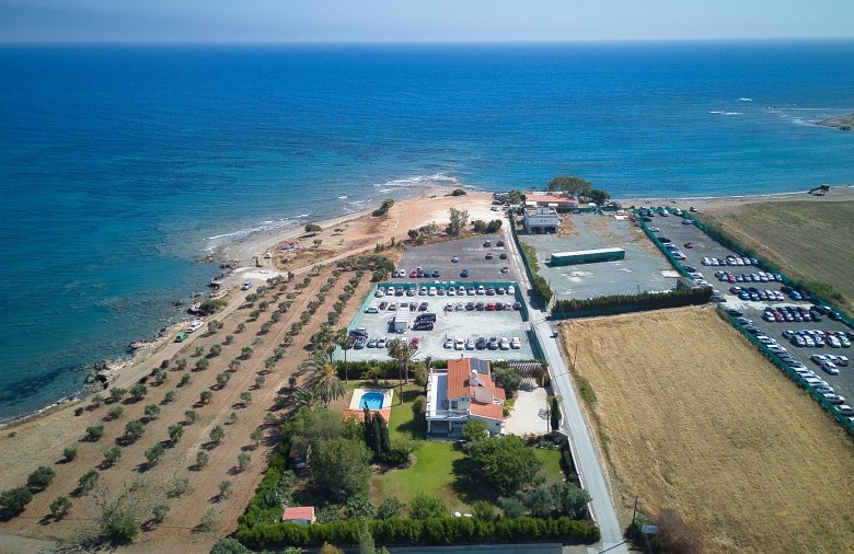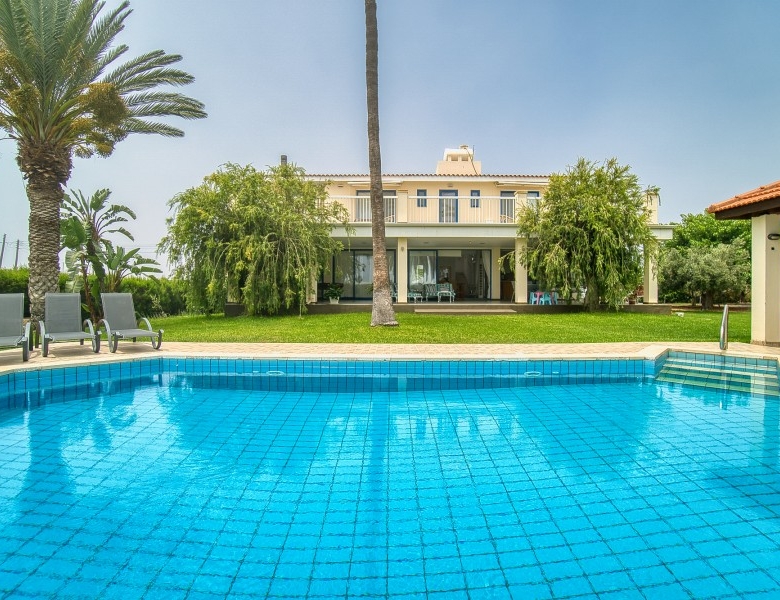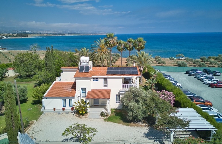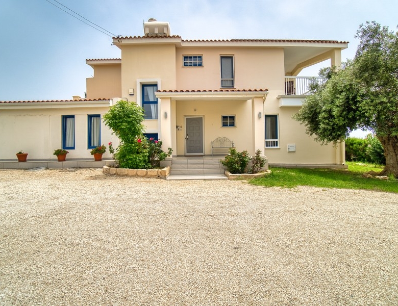 We offer for sale a villa near the Paphos Airport and 50m from the sea. The villa is on two floors. It has 5 ensuite bedrooms, open plan sitting/dining room (with a fire place) and kitchen, guest toilet, an en suite maid’s/laundry room with an independent entrance, large covered and uncovered verandas both on the ground and first floor, with panoramic sea views. It has a solar water heating system, photovoltaic panels, water pressurising system and alarm system. There are a/c units in all rooms. All the doors and windows have aluminium frames and are double glazed. The garden has been designed by a garden designer and it has an automated irrigation system, grass, mature fruit and decorative trees, palm trees, bushes and flowers. It is fenced all around with α high fence. There are two large gates at the front and a drive-in/out and an aluminium pergola with parking space for two cars. It has an 8X10 m swimming pool, with built-in stairs and special anti-slip tiles. Adjacent to the swimming pool there is a 10X5 kiosk , a shower and w/c for the needs of the pool. In the back corner of the garden there is a shed (5X4) and a small gate for an easy beach access. There is a well for the need of the swimming pool and a water supply from the government dam for the needs of the garden.