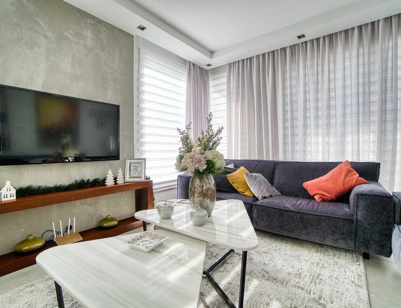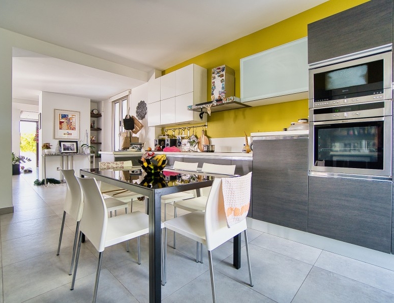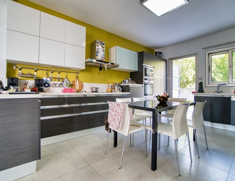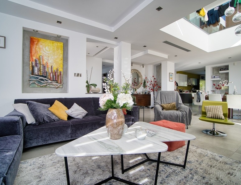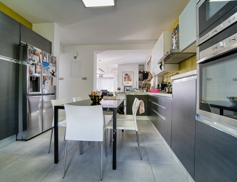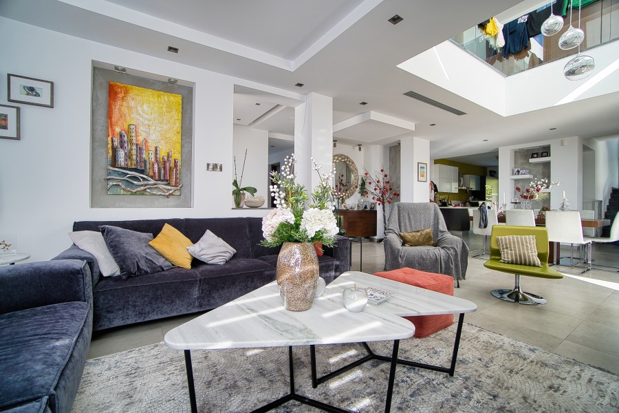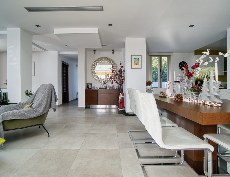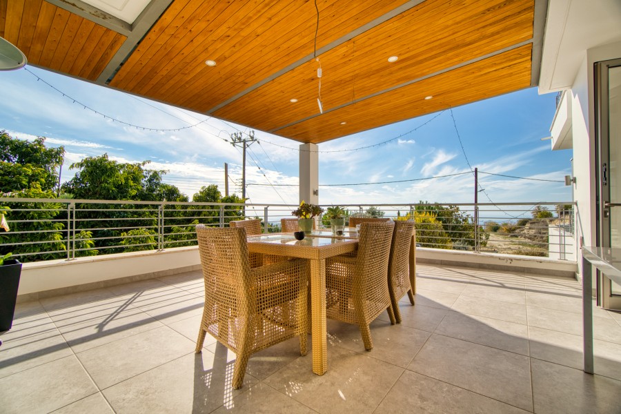 Modern design villa 248 sq.m (covered area) 315 sq. m. total premises area in Tsada, built in a plot of 1619 sq. m. It has stunning panoramic sea and mountain views. Located on the drive up to Tsada, set on a hillside (Olympus). The house is approximately 10 min. drive north of Paphos, 10 min. drive to Tsada Golf Club and 5 min drive to the International School. Its a 3 level property situated at the end of a private road, with a split driveway, one leading to the main entrance and the other to the lower basement area with two-car covered parking, which can be converted into a self-contained apartment. Entering (2nd level), the house has a spacious living/dining room and a second lounge (family room). On the same level there is a study room and a guest WC, plus a large covered balcony with amazing sea view and double access from the dining area and the living/family room. At the back of the house, outside the kitchen, there is a covered patio with al fresco dining and a large garden area and a built-in BBQ. Upstairs there are 3 double bedrooms, full family bathroom, en-suite bathroom in the master bedroom with a corner bath/jacuzzi and a feature cubical shower, walk-in wardrobe and access to another sea view balcony. On the same floor there is a laundry room. At the lower basement area behind the garage port and attached to the property, there is a service/maid or storage room with a WC. At the same level at the very rear of the house, there is a 200 sq.m. landscaped garden with grown up local trees/flowers. Features: Italian manufactured floors-granite worktops, full thermal insulation, underfloor gas central heating, water pressure system and water filter under kitchen cabinet, double glazing, fireplace, utility room, ac units, security system with alarm, photovoltaic system of 7.9 KW, bbq area at kitchen level, permission to construct a private swimming pool, borehole, irrigation system, title deeds. Furniture and electrical appliances are negotiable.